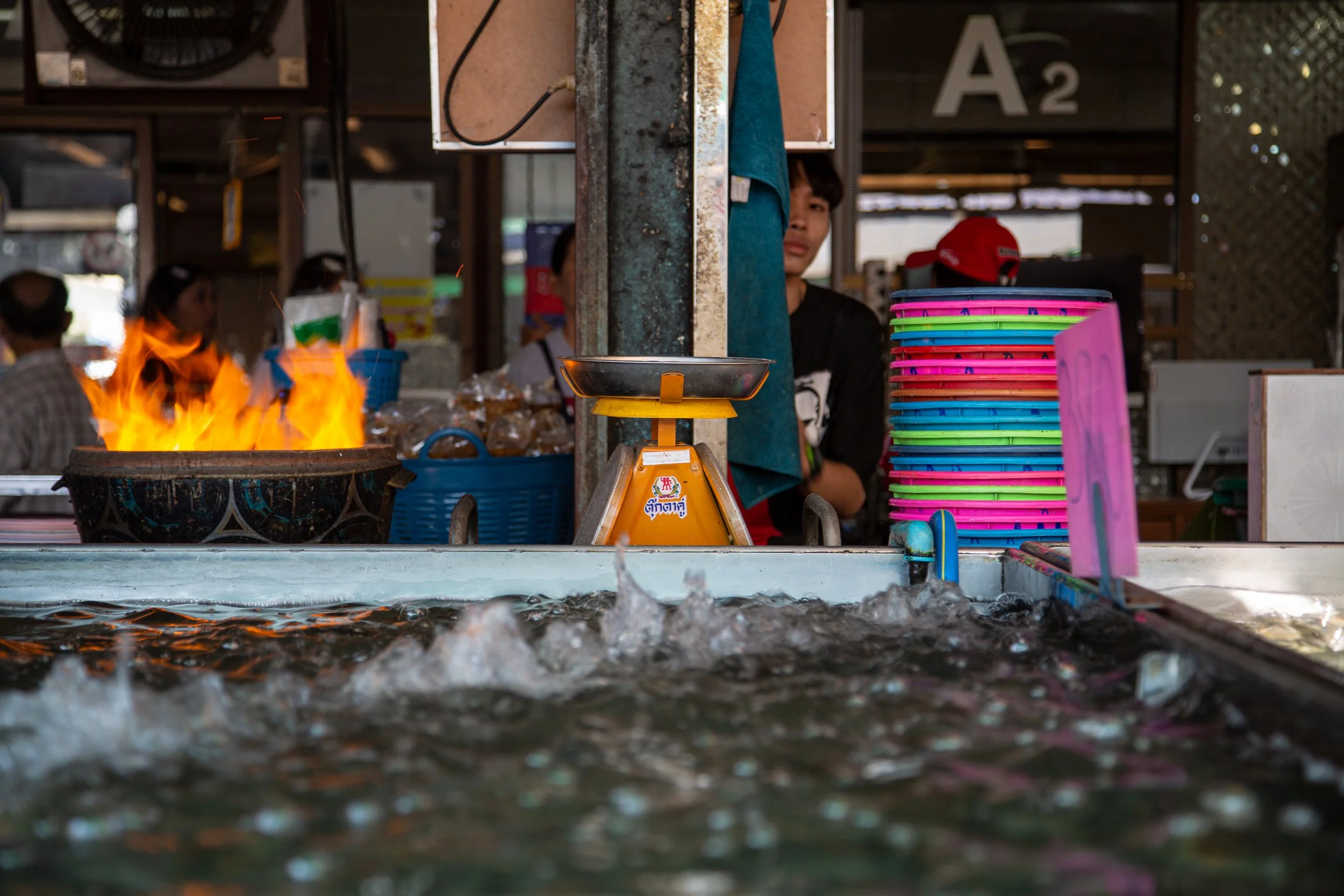 Boy in front of fish shop. Thailand.